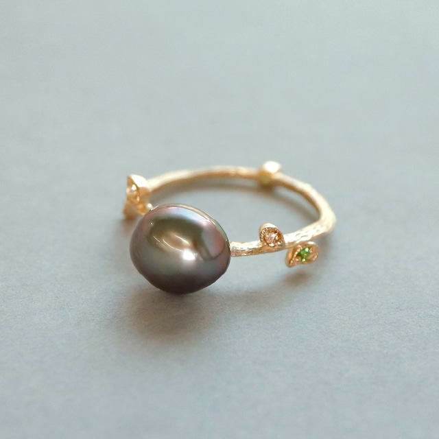 【オンランショップ限定・先行販売】 2/26~3/26まで 限定品1点もの・ロゼッタスティッラ K10イエローゴールド サイズ:11号(初回サイズ直し無料) メイン石:ナンヨウパール(ケシパール) 脇石:アメジスト/ローズカットダイヤ/ブラウンダイヤ/グリーンガーネット 掌側:エメラルド 品番:0835020