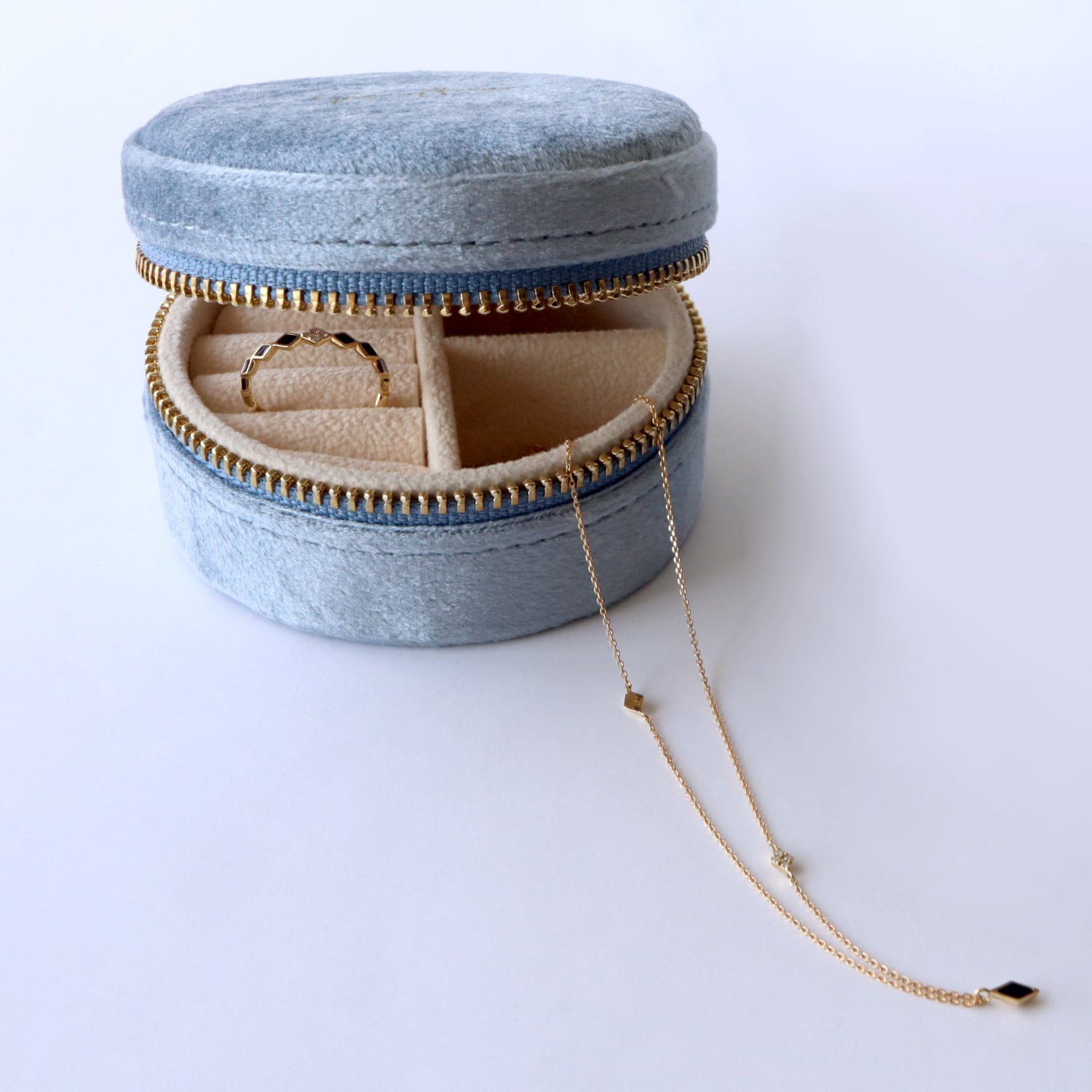 内側はスエード調のやさしい質感で、ネックレス(またはブレスレット)、ピアス、リングなどをコンパクトに収納できます。