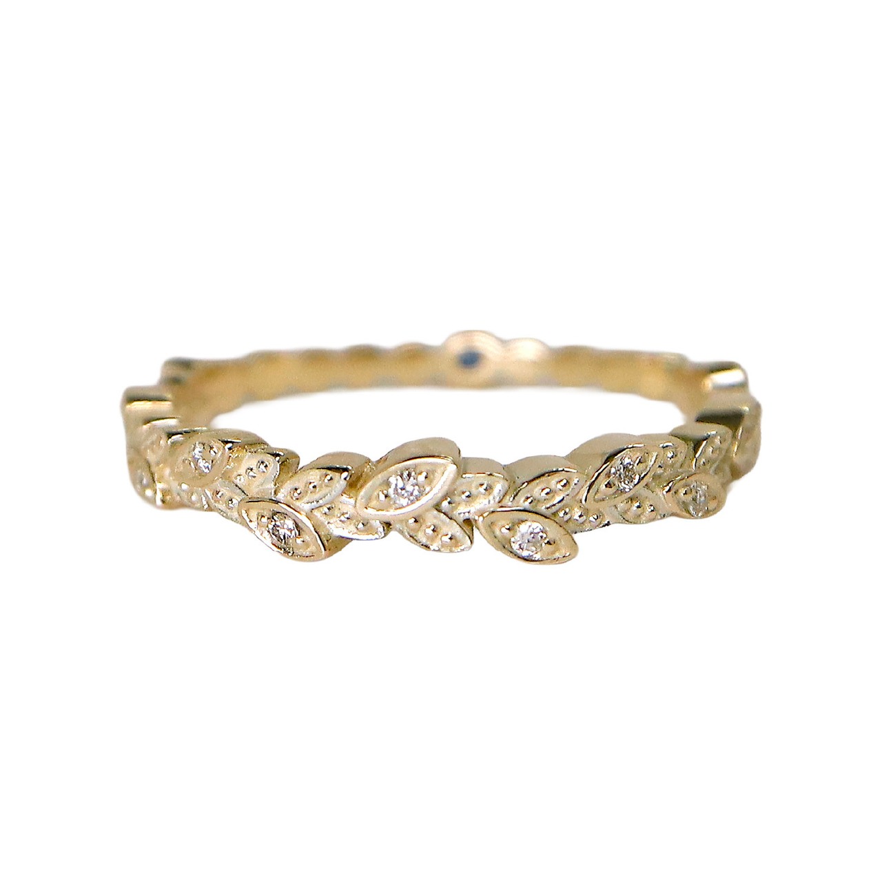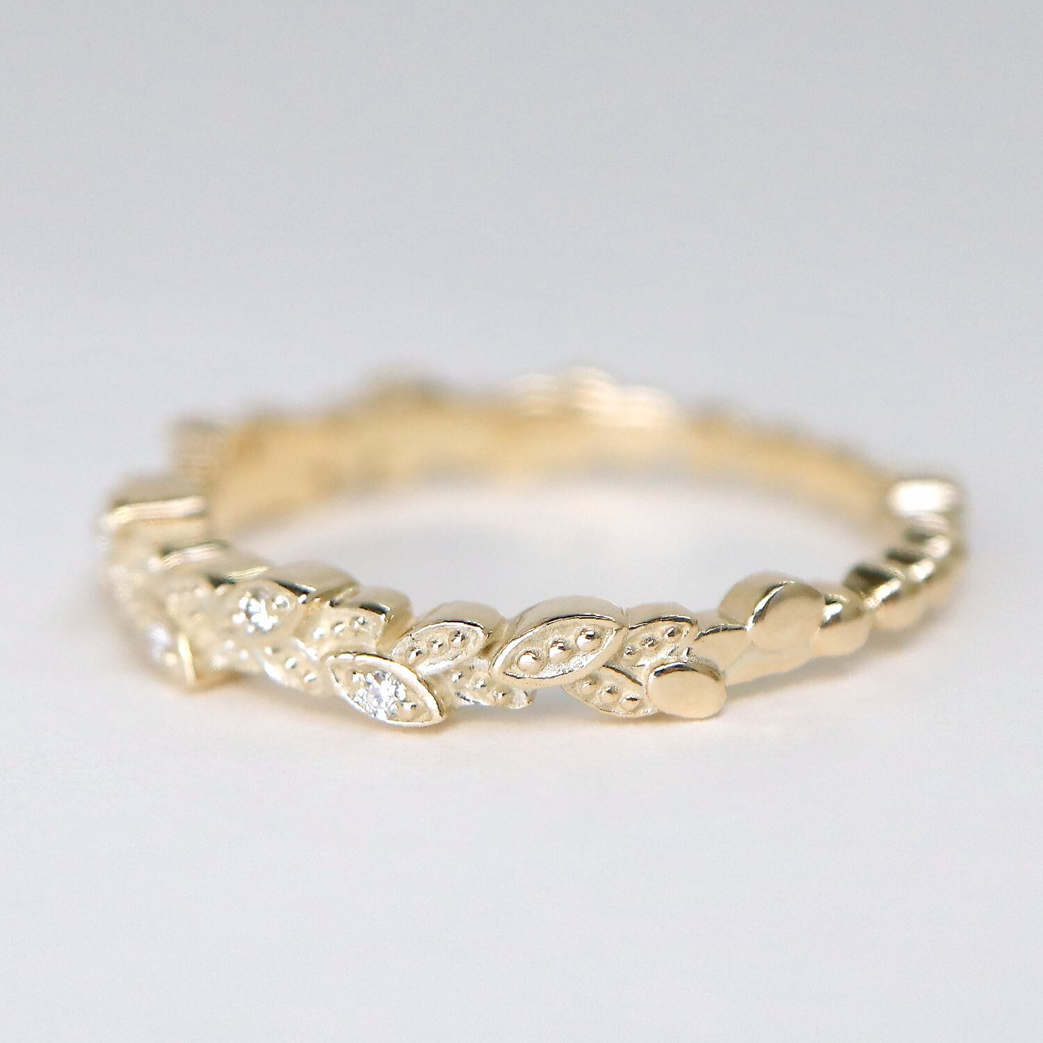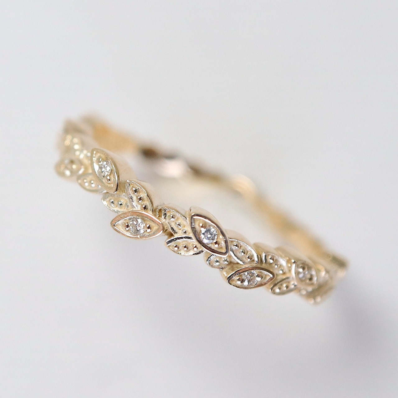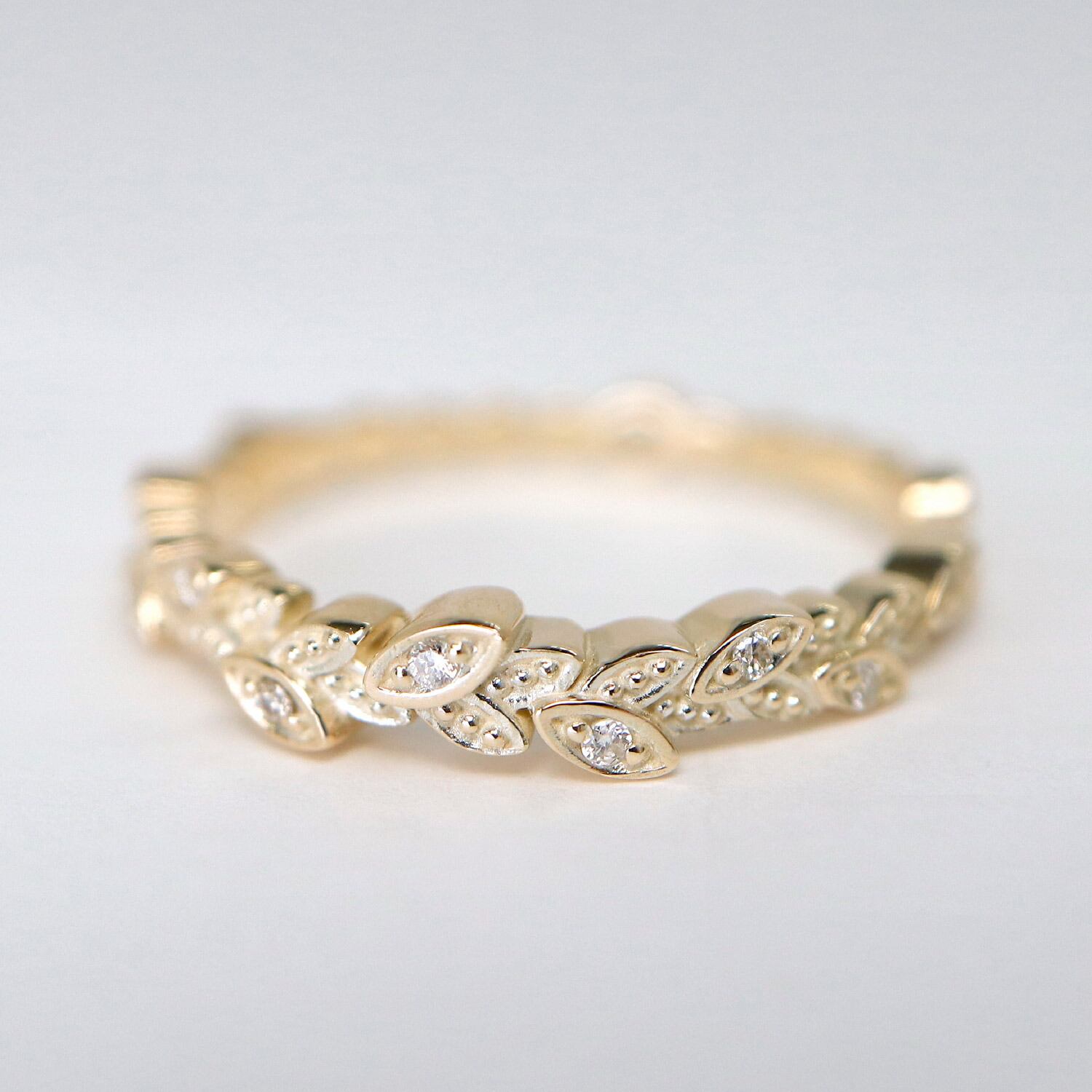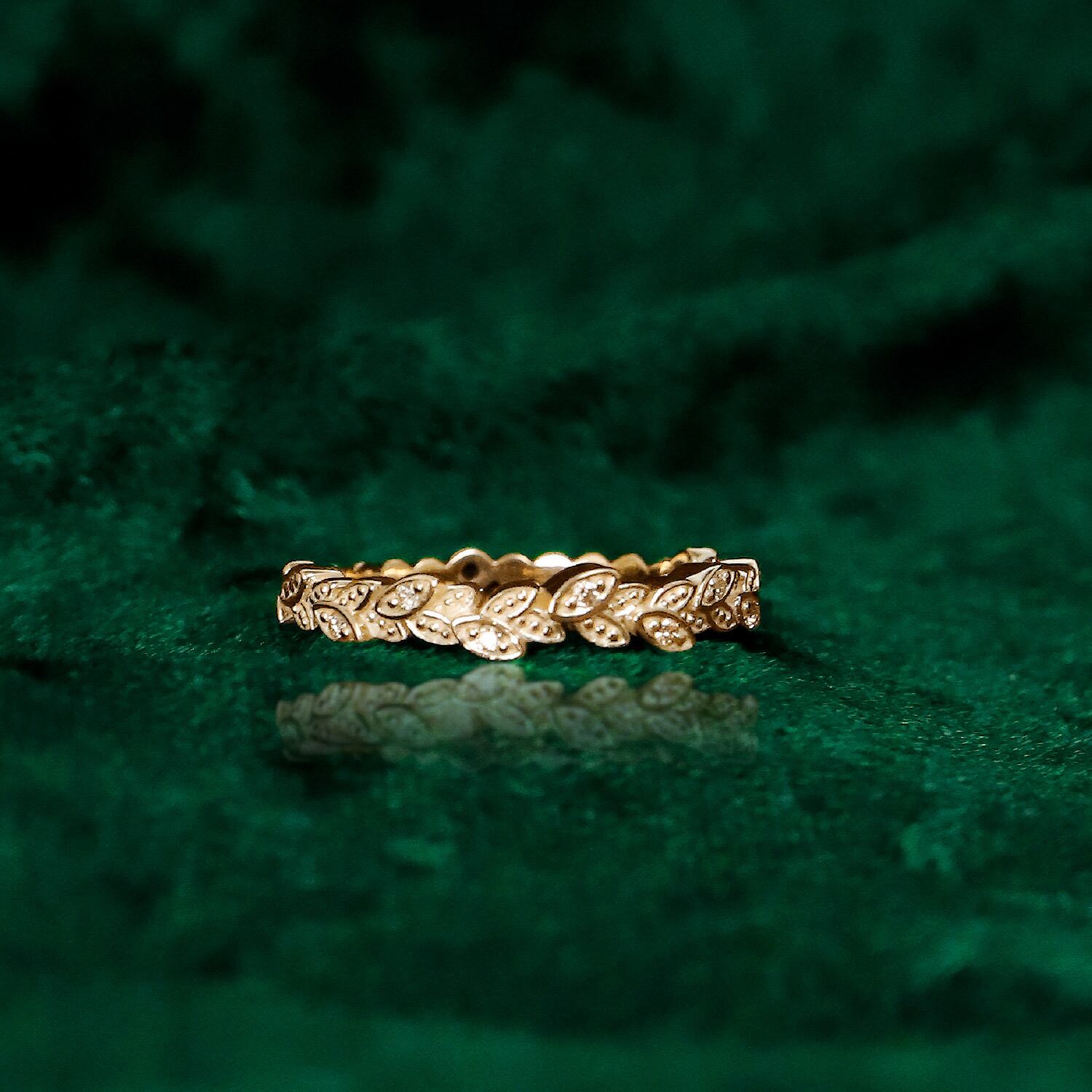 葉のところどころにダイヤモンドを丁寧にセッティングし、光を受けるたびにさりげなく輝きを放ちます