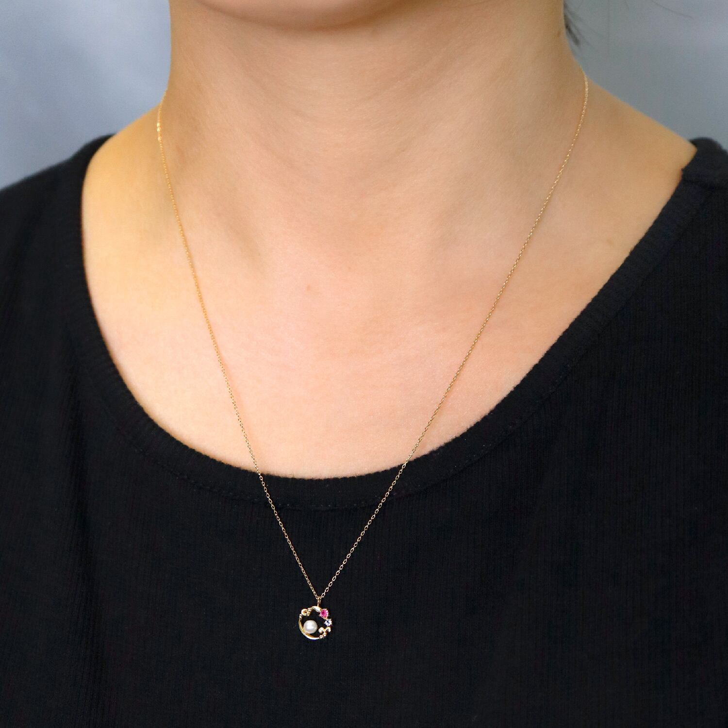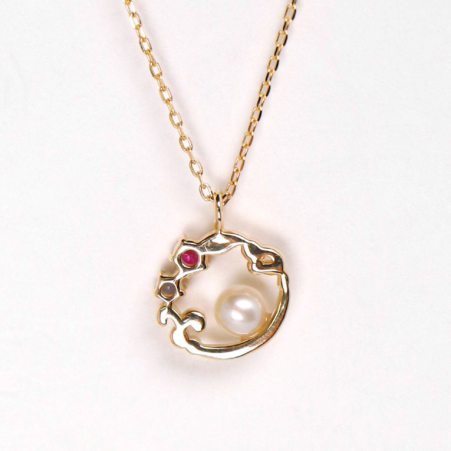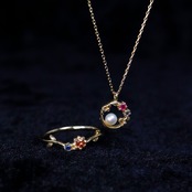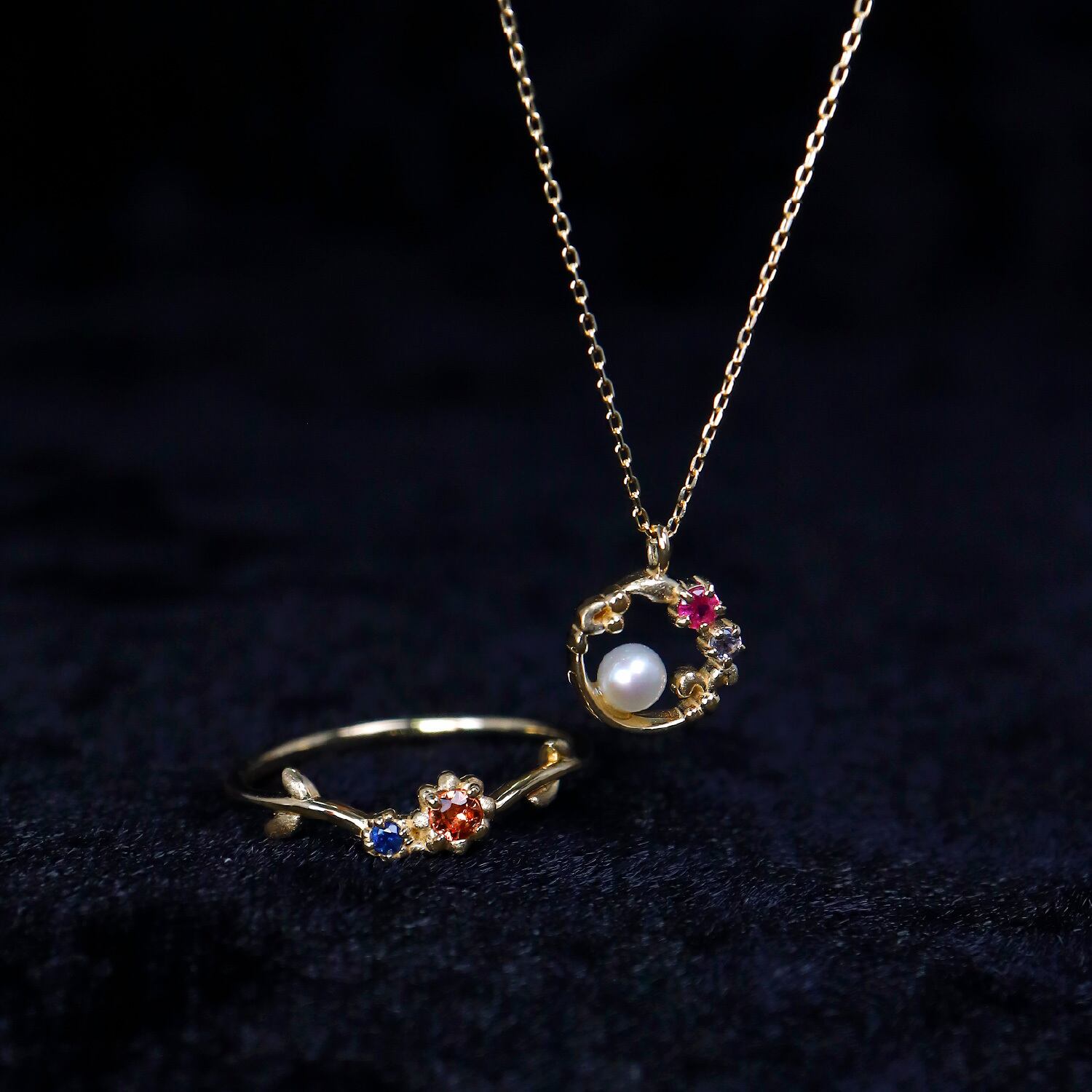 淡水パールの優しい艶と鮮やかなルビーやアウイナイトといったカラーストーンがさりげなくちりばめられ、