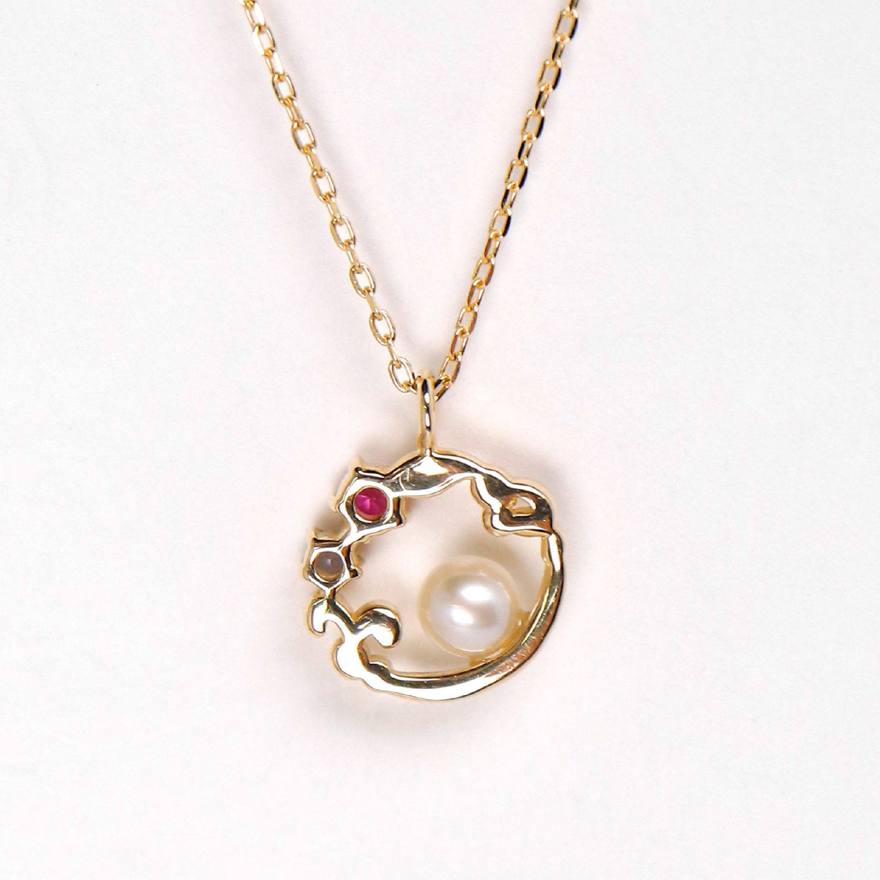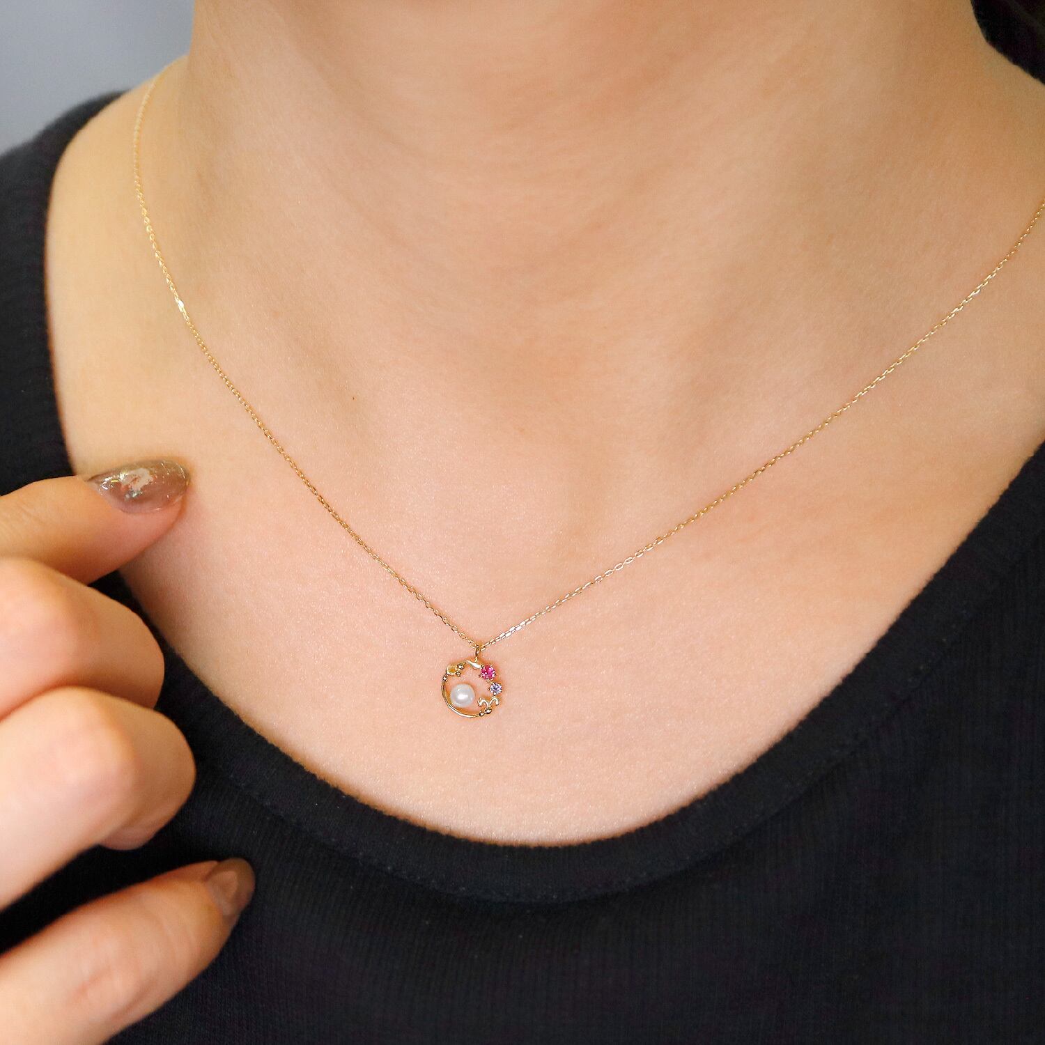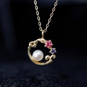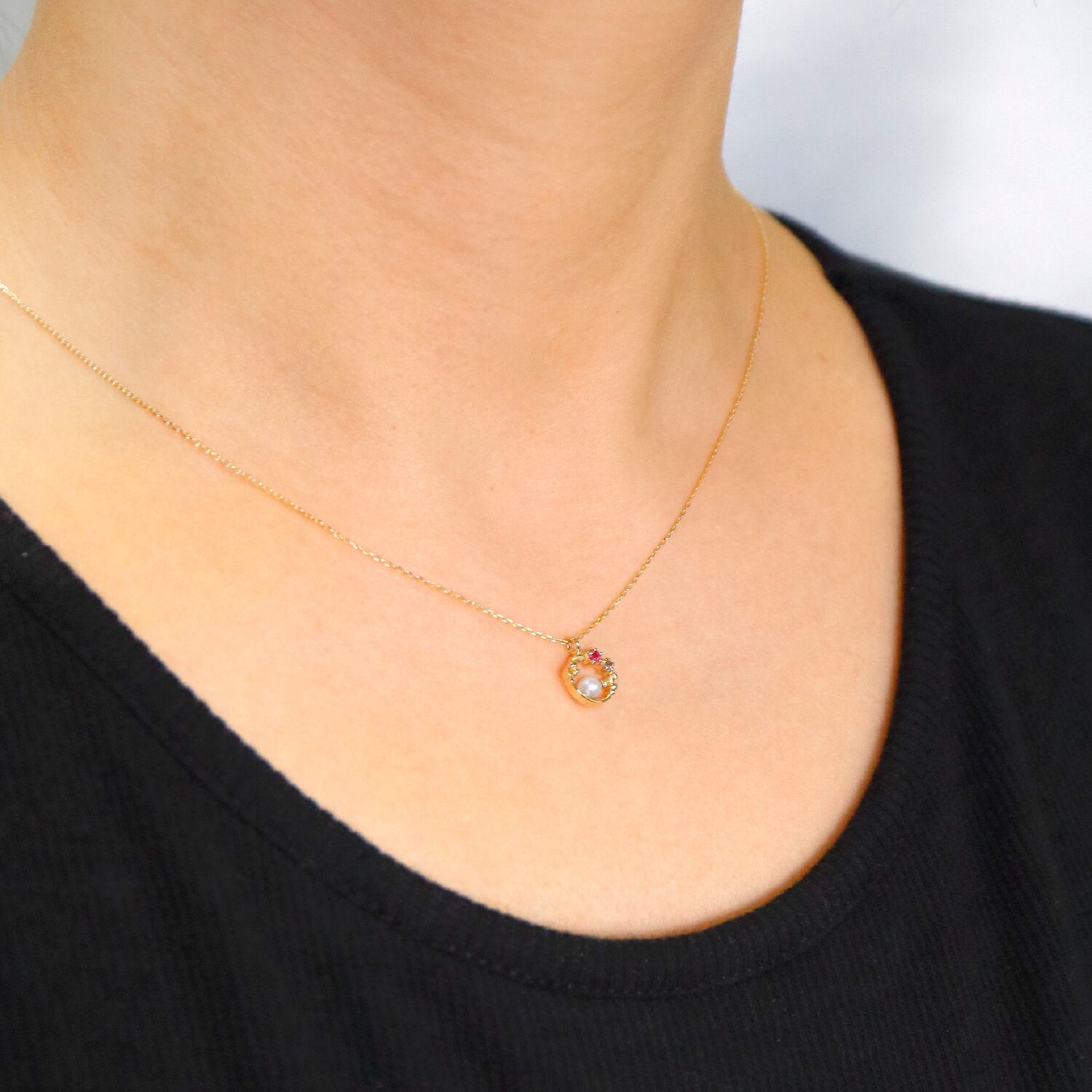 淡水パールの優しい艶と鮮やかなルビーやアウイナイトといったカラーストーンがさりげなくちりばめられ、