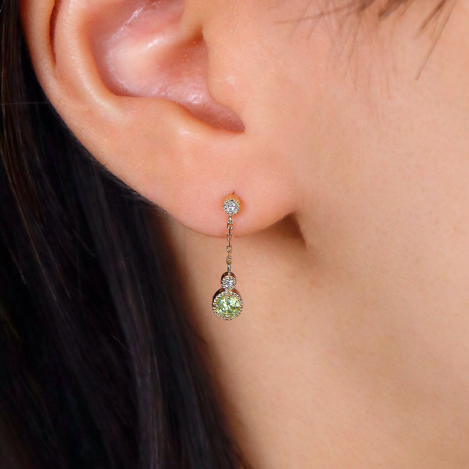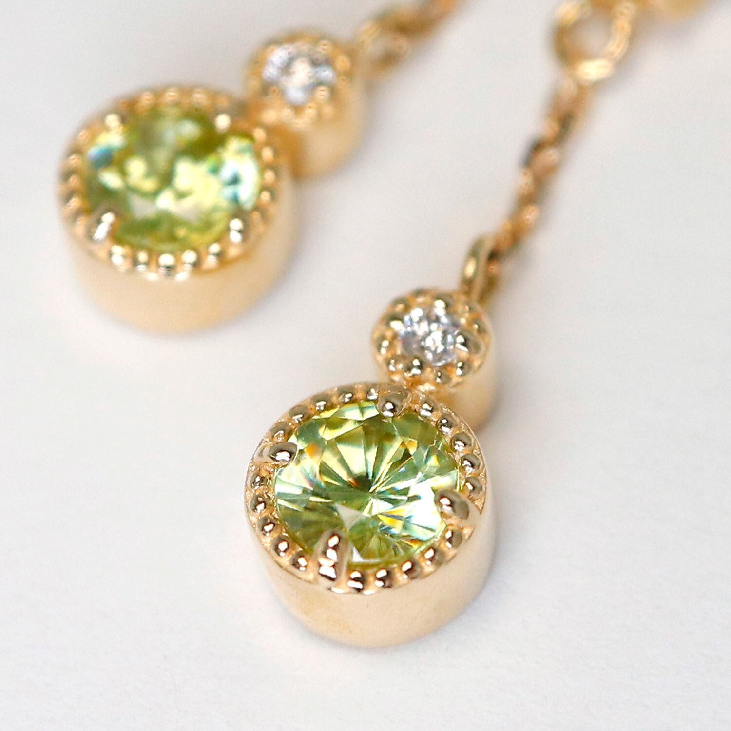 スフェーンとダイヤ、ふたつの輝きが重なり、動くたびにきらめく繊細な光の連鎖を描きます。
