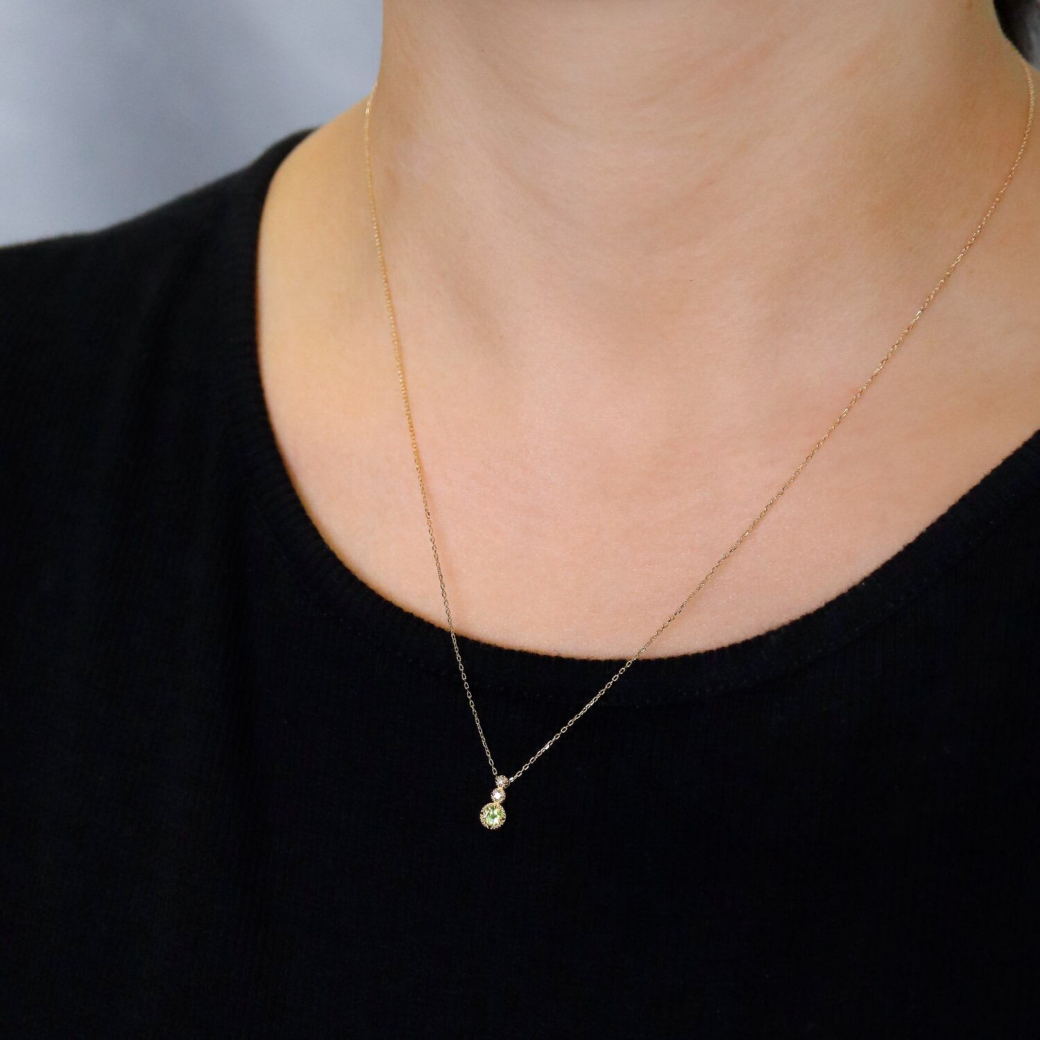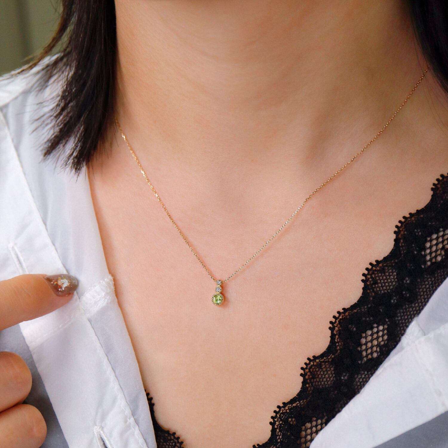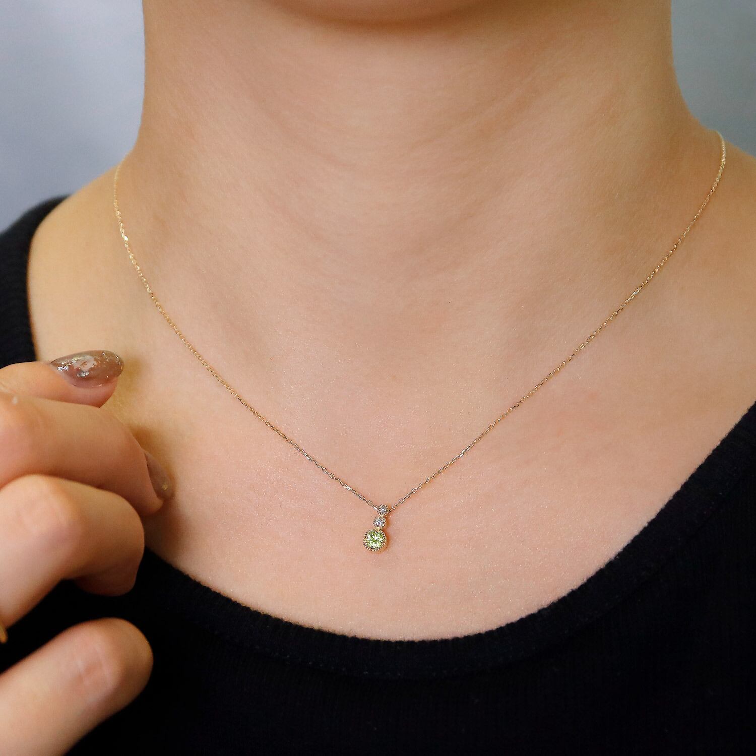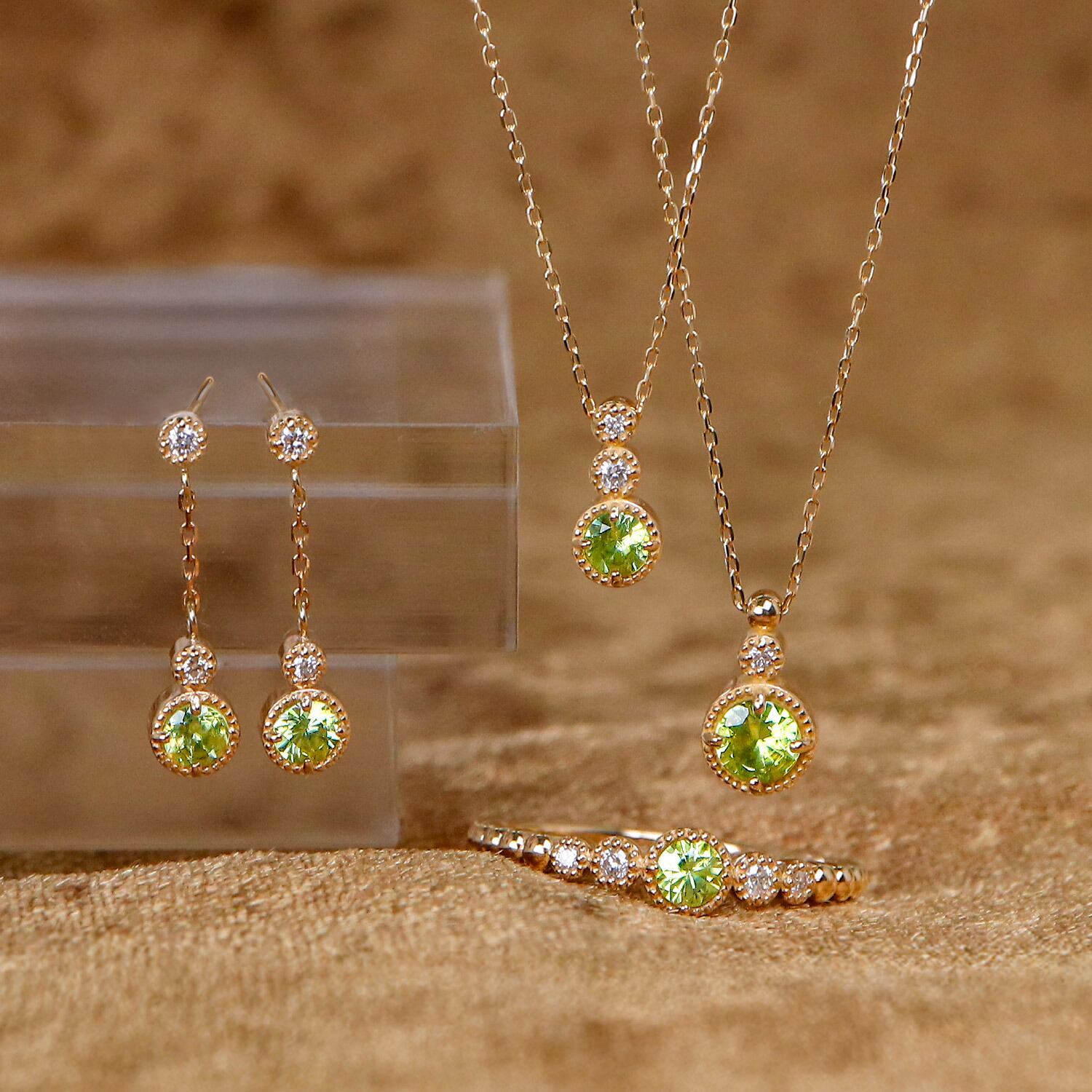 ライトグリーンのスフェーンが胸元で華やかに煌めきます。