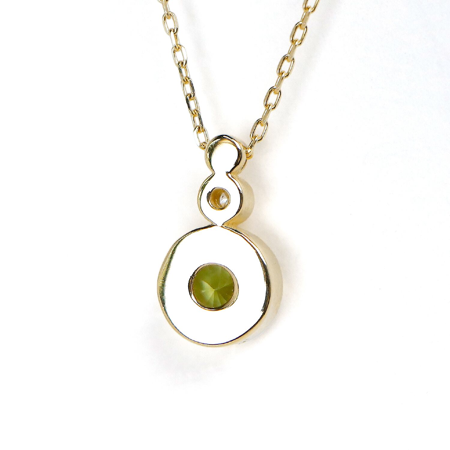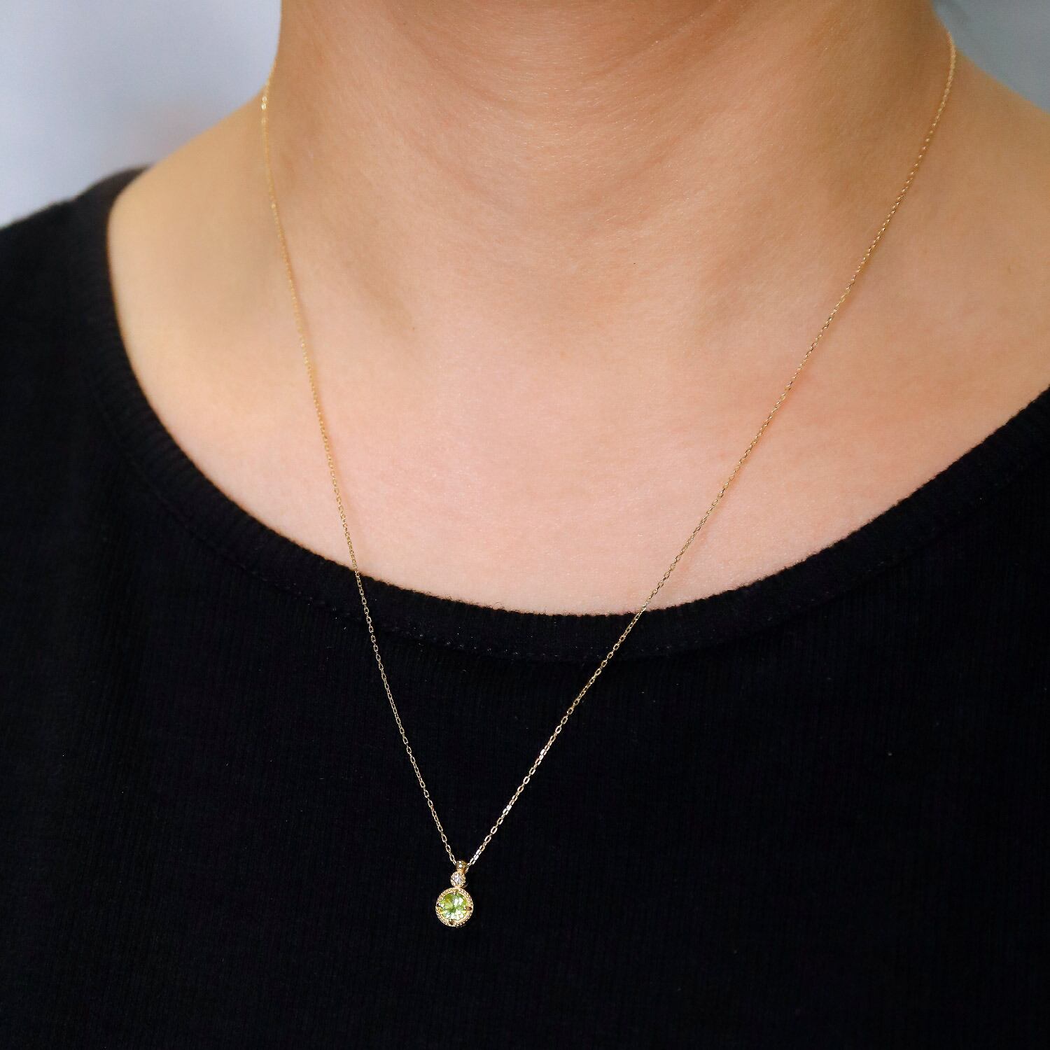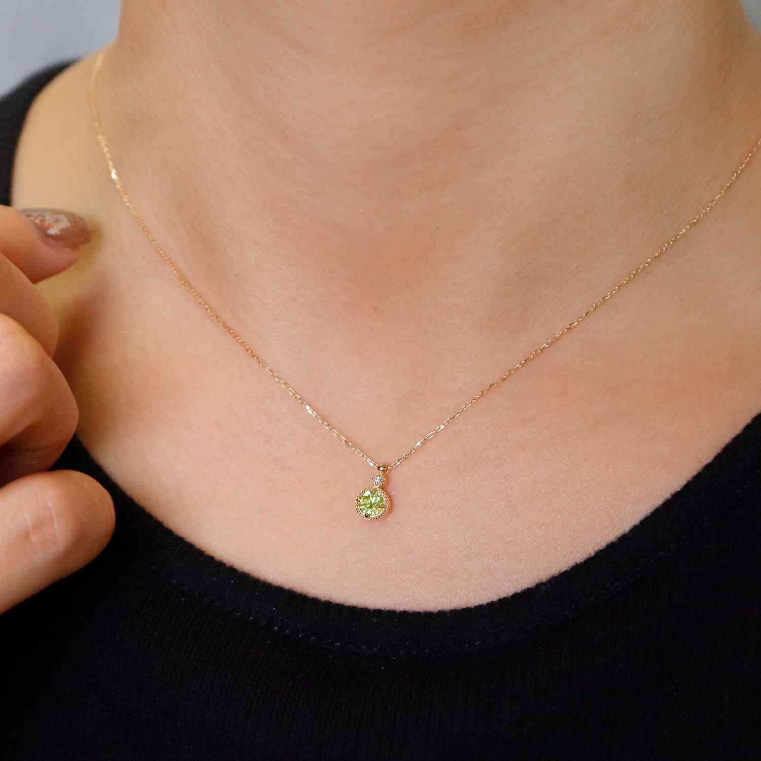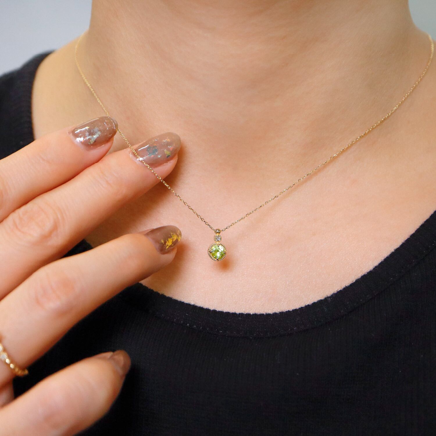 ライトグリーンのスフェーンが胸元で華やかに煌めきます。