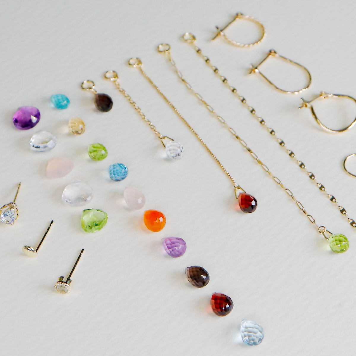 “想いを宿す石”と“かたちの美しさ”をテーマに、ピアス本体とチャームを自由に組み合わせて楽しめるシリーズです。